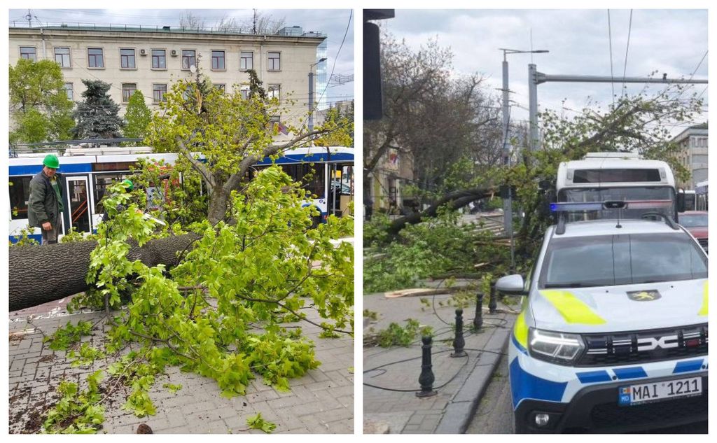 Incident în centrul Chișinău, după ce o creangă s-a prăbușit peste un troleibuz, pe bulevardul Ștefan cel Mare și Sfânt, în contextul vântului puternic anunțat de meteorologi.