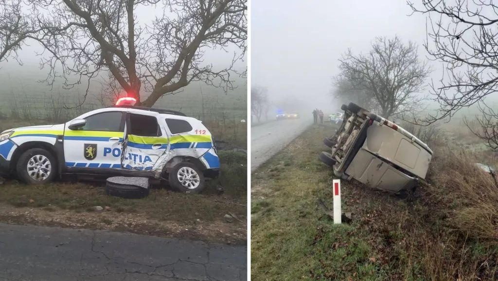 Conform primelor informații, în urma coliziunii, microbuzul s-a răsturnat, iar mașina de poliție a fost proiectată pe marginea drumului.